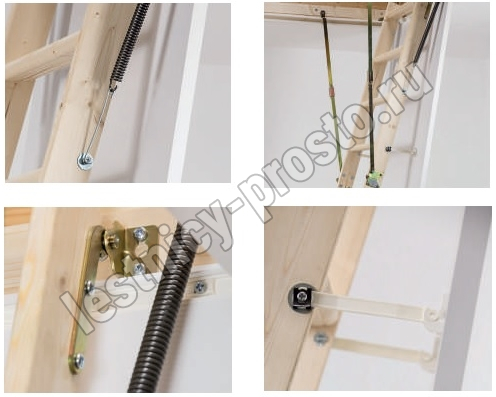 В комплекте: люк из сэндвич-панели, пружинный механизм "короб-рычаг", короб, трехсекционная лестница с буковыми ступенями, замок люка, штанга для раскладывания лестницы, пластиковые наконечники для ножек