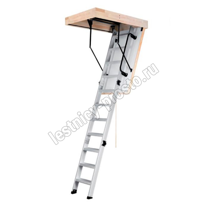 Складная 3-х секционная чердачная лестница. Рабочая поверхность полностью выполнена из алюминия. Термоизоляционная крышка типа "сэндвич" имеет усиленную теплозащиту, облицована с двух сторон ДВП белого цвета. По контуру короба имеется уплотнитель; Все металлические элементы лестницы покрыты порошковой краской.