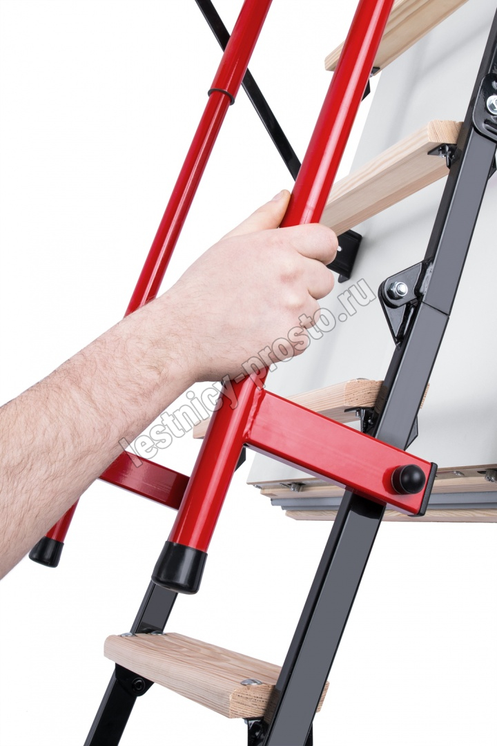 Лестница чердачная, складная, комбинированная 3-х секционная, металлические направляющие/деревянные ступени. Короб люка имеет двухточечную систему запирания. Телескопический поручень имеет внутреннюю пружину и при складывании лестницы служит механическим приводом, что облегчает процесс. Делает его полуавтоматическим. Оборудована дополнительной ступенькой на люке помогающей комфортно подниматься и спускаться. Термоизоляционная крышка типа "сэндвич", толщиной 86мм, утеплена пенопластом, облицована с двух сторон ДВП белого цвета. Лестница подходит для установки в местах с большими перепадами температур. Короб деревянный, высотой 170мм., по периметру проходит уплотнитель. Лестница выпускается для немецкого и английского рынка.