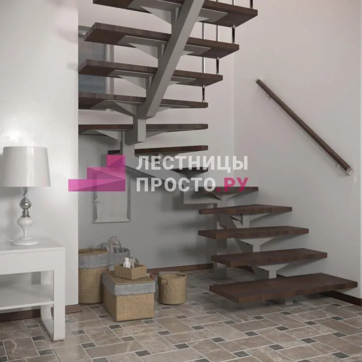 Удобная лестница на косоурах с поворотом на 90 градусов. Открытые ступени визуально облегчают конструкцию. Ограждения по всему маршу обеспечивают дополнительную безопасность и возможность декорирования. Монтаж осуществляется силами двух человек на объекте по указаниям, приведенным в паспорте на лестницу.