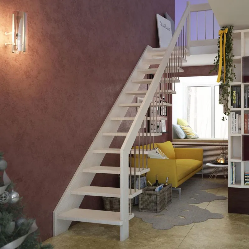 Компактная лестница из дерева. Удобный подъем засчет забежных ступеней и ограждений, которые входят в стандартную комплектацию. В стандартной комплектации столбы квадратные, балясины точёные. Элементы лестницы и ограждения поставляются в разобранном виде без какого-либо покрытия.