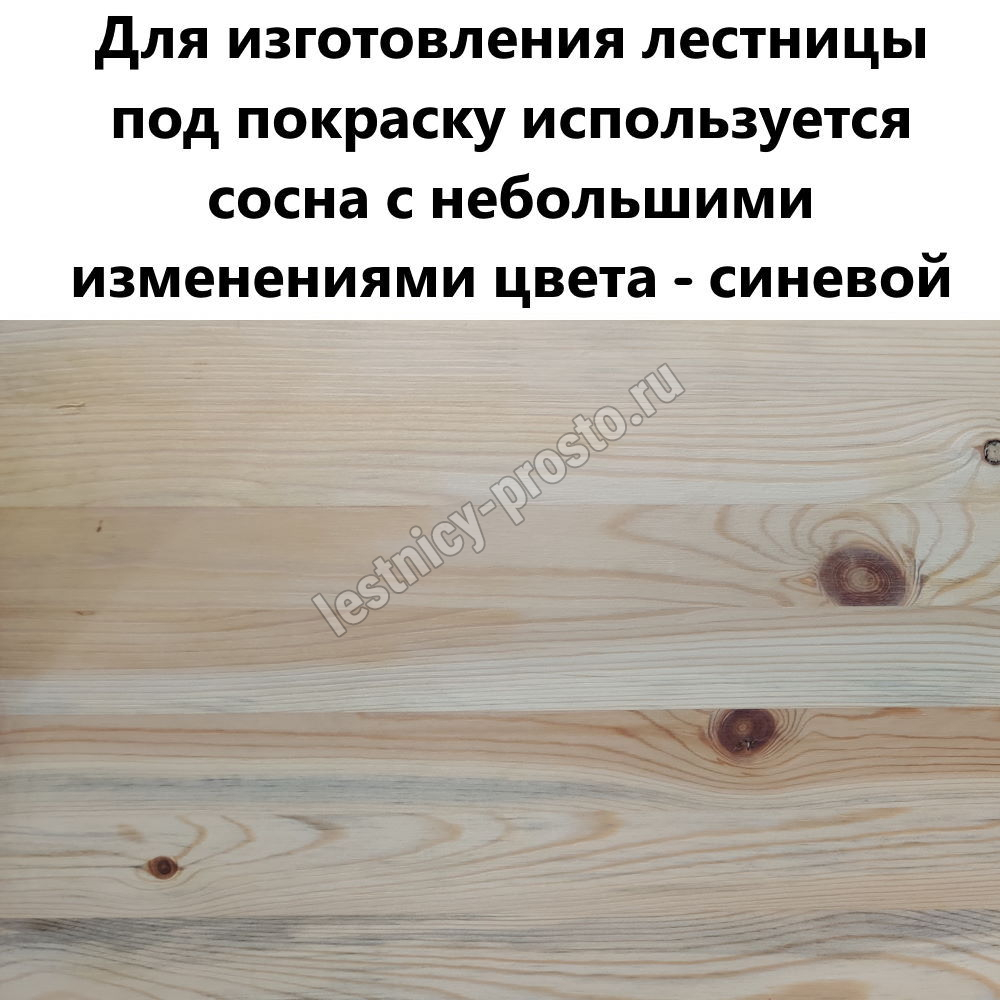 Для изготовления лестницы под покраску используется сосна с небольшими изменениями цвета - синевой, такой допустимый порок древесины существенно не влияет на ее механические свойства и практически незаметен при покраске в тёмные цвета.