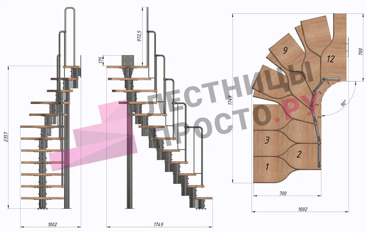Лестница Prosto Urban Black гусиный шаг 700 мм, h216-312 см (12 ступеней), ясень