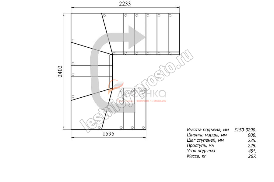 Модульная лестница Спринт 225 3150-3290, Черный, Сосна, Нержавеющая сталь