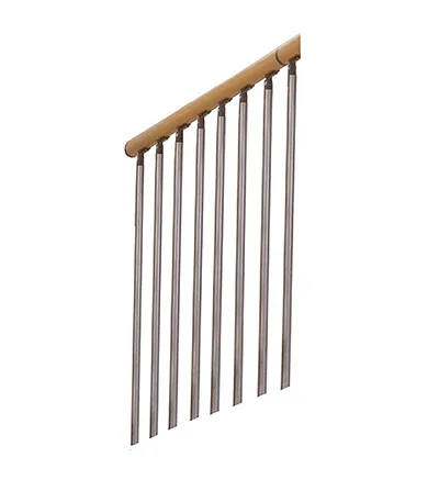 Материалы полностью повторяют материалы ограждения лестницы: поручень выполнен из пвх с текстурой дерева, стойки из хромированной стали.
