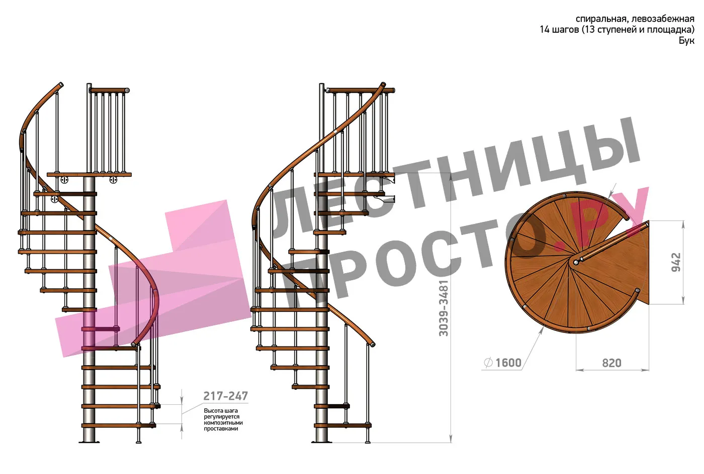 Винтовая лестница Prosto Spiral Black D160см, h303.9-348,1 см, бук