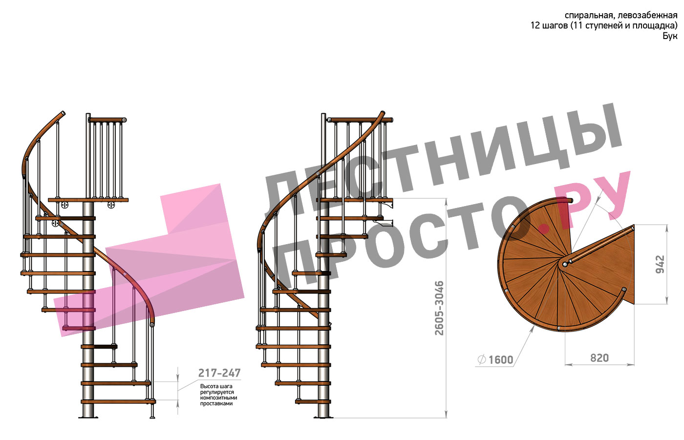Винтовая лестница Prosto Spiral White D160см, h260.5-304.6 см, бук |