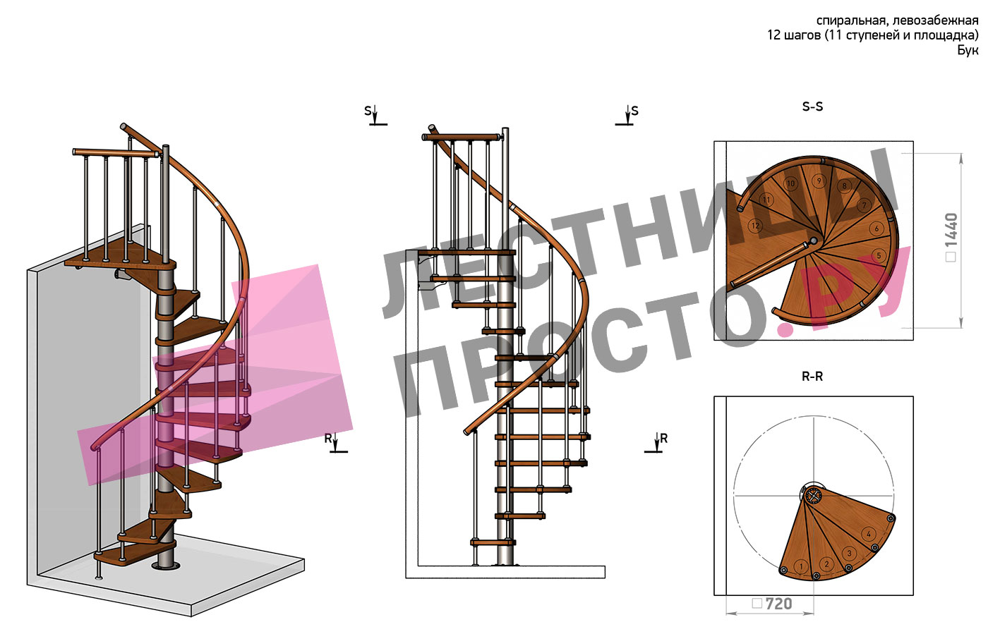 Винтовая лестница Prosto Spiral White D120см, h325.7-369.8 см, бук |