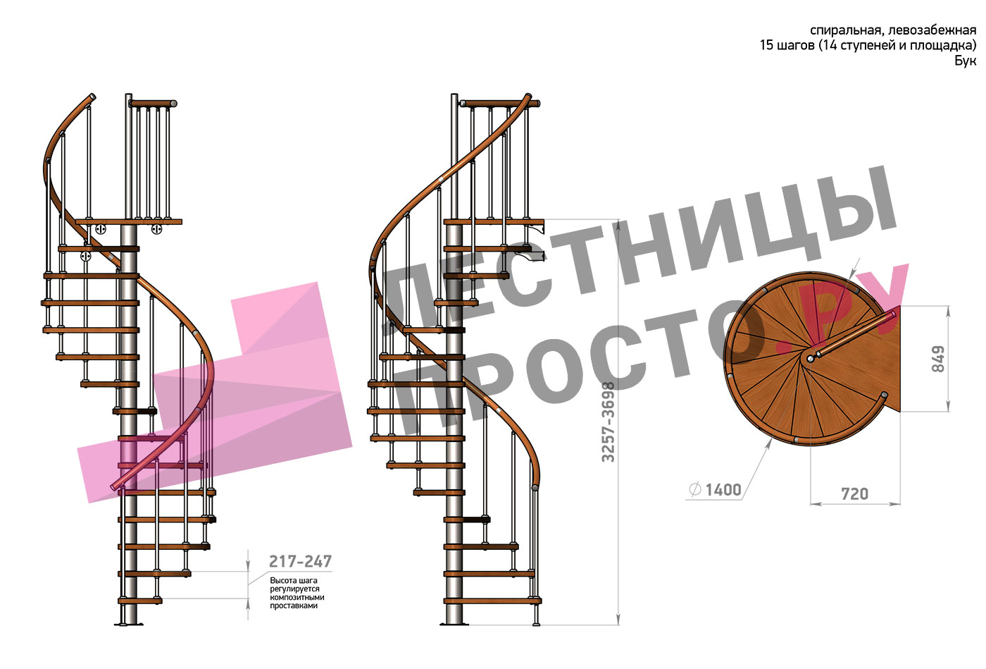 Винтовая лестница Prosto Spiral White D140см, h260.5-304.6 см, бук |