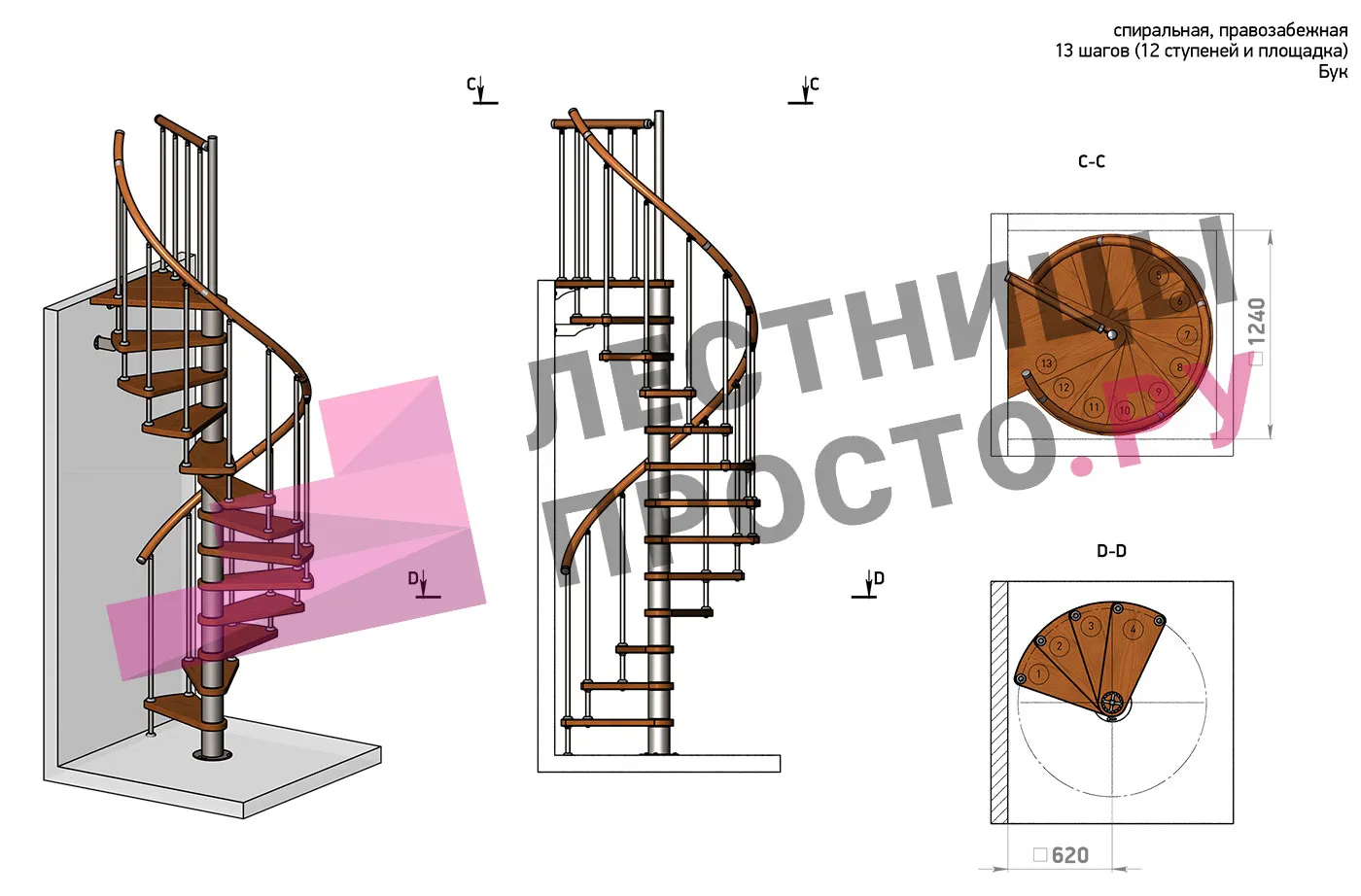 | Винтовая лестница Prosto Spiral White D120см, h303.9-348,1 см, бук |