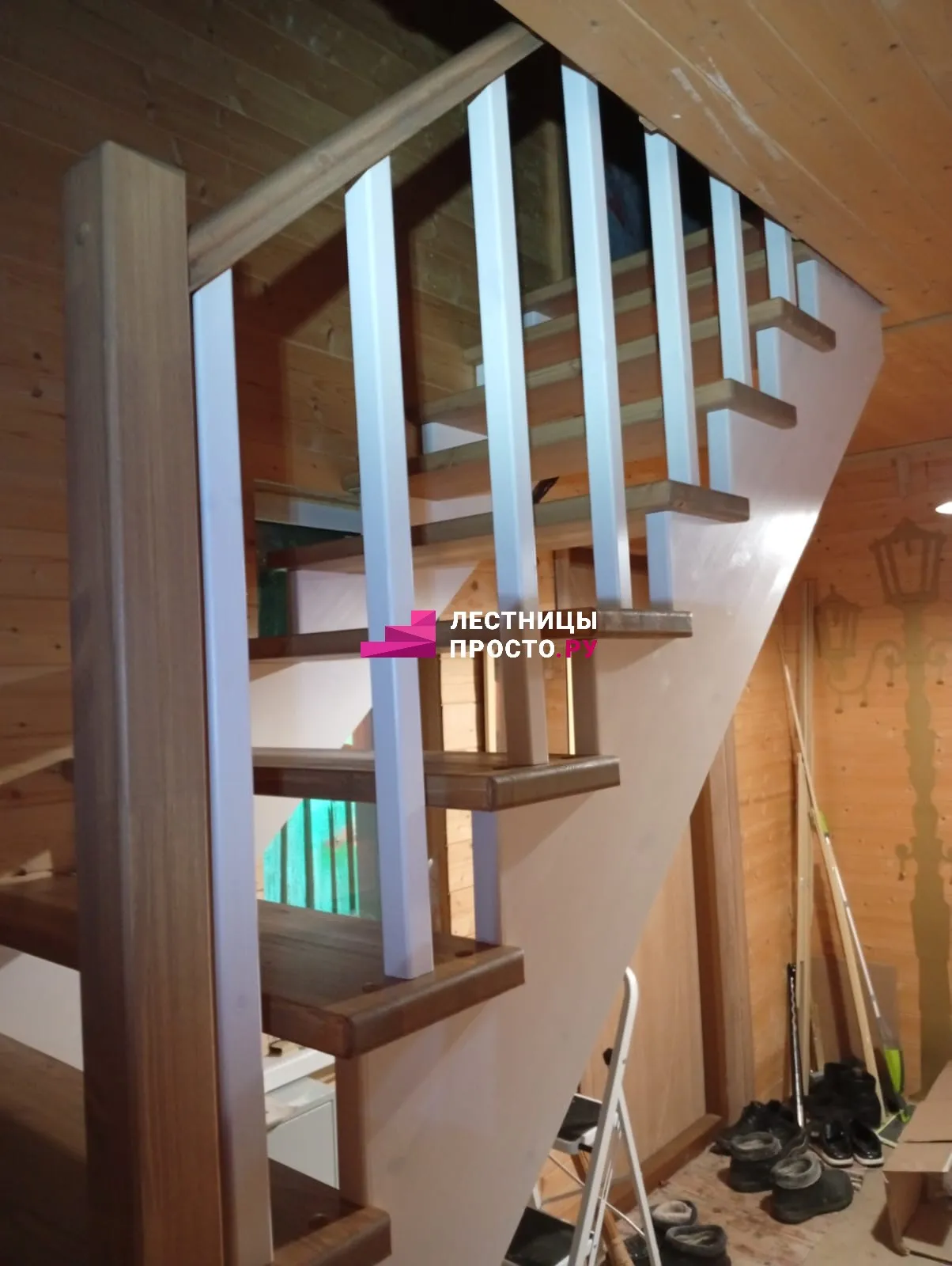 Лестница из сосны с поворотом и подступёнками для частного дома
